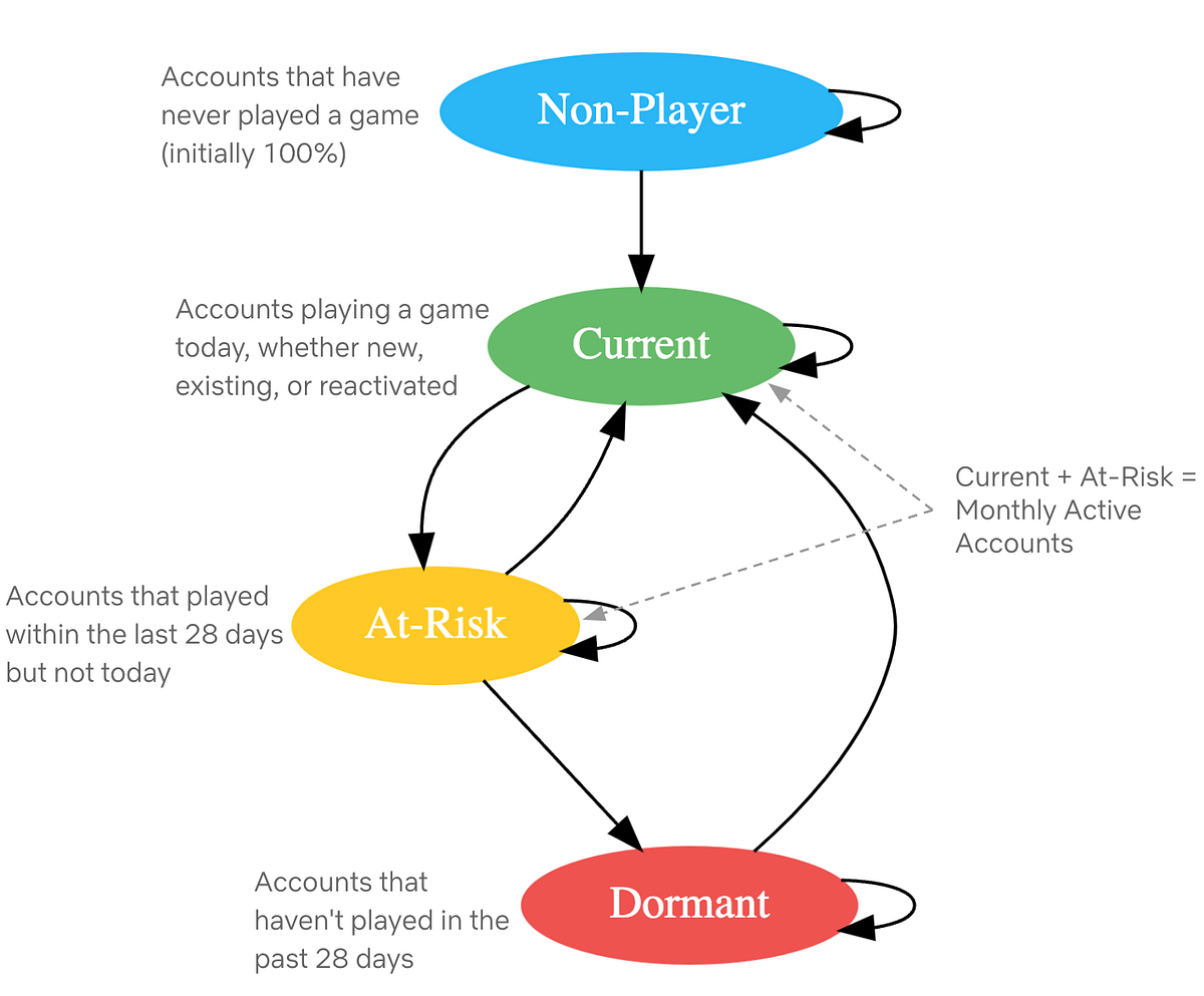 - Regular State: We are able to calculate the regular state of the state-transition matrix (excluding new gamers) to estimate the MAA as soon as all accounts have tried Netflix video games and perceive long-term retention and reactivation results.